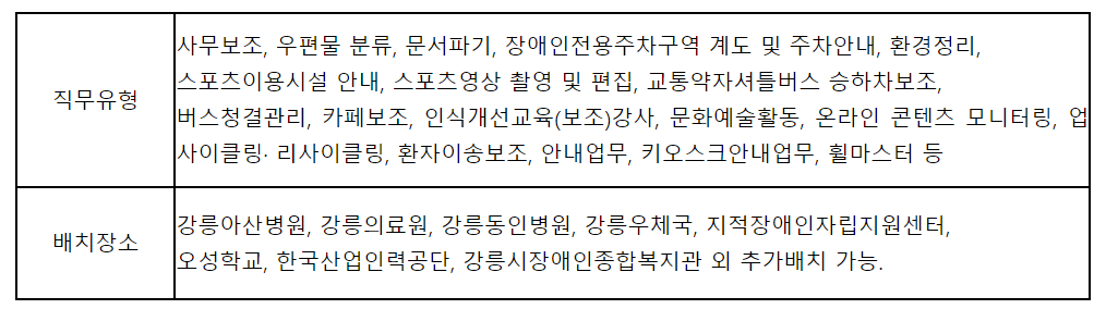 강릉시 장애인복지관에 참여하는 일자리 유형 및 배치장소