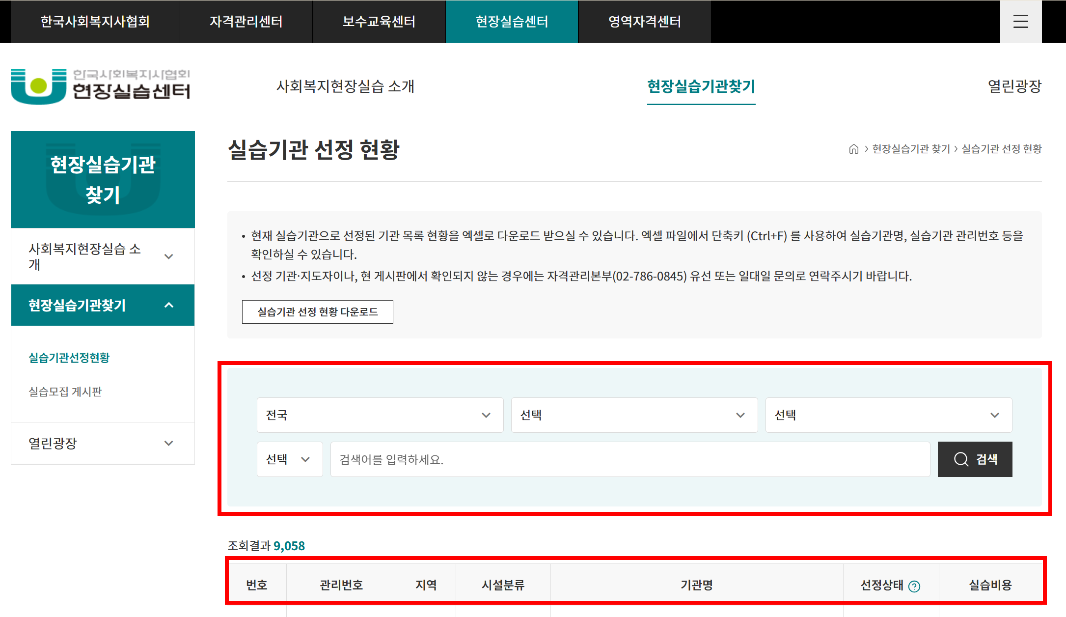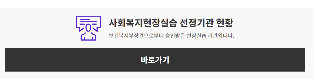 또한 같은 홈페이지에서 사회복지현장실습 선정 기관 현황도 조회하실 수 있습니다.