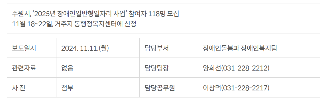 수원시 장애인 일자리 사업 일반형 참여자 모집