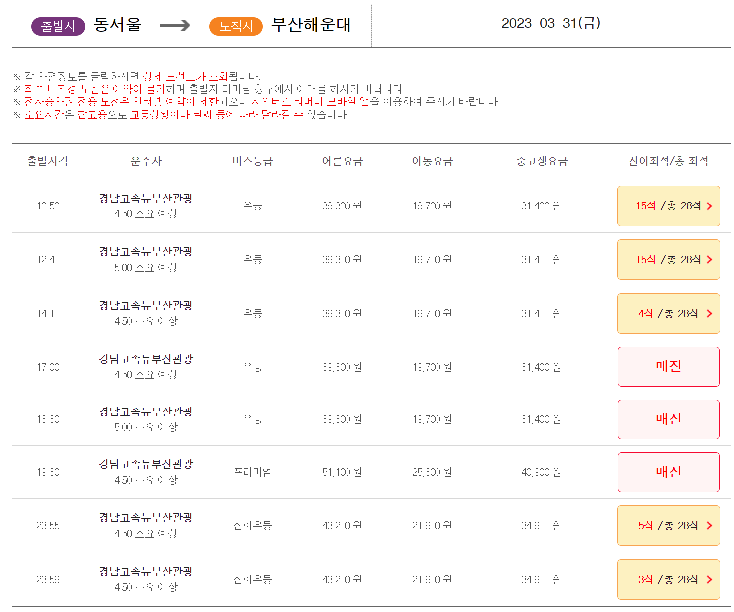벌써 잔여좌석이 얼마 안남았거나 매진 된 시간도 있네요. 조회를 누르면 요금과 소요시간, 잔여좌석을 확인 할 수 있습니다. 원하는 시간대에 좌석이 있으면 잔여좌석을 눌러줍니다.