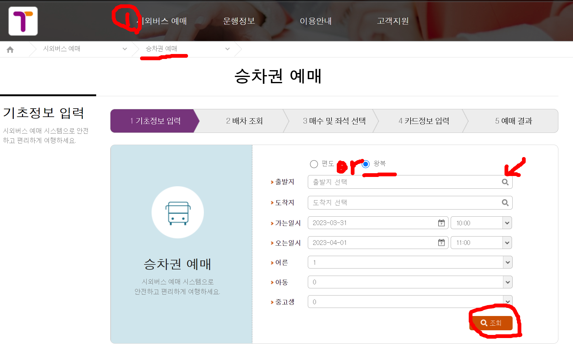 홈페이지에 접속 후 시외버스 예매 - 승차권 예매 - 편도 또는 왕복 선택 - 출발지, 도착지, 명수 선택 후 조회를 클릭합니다.