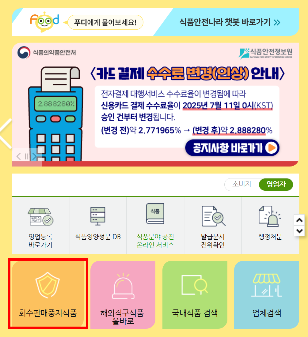 2. 하단에 있는 회수판매중지식품을 눌러줍니다.