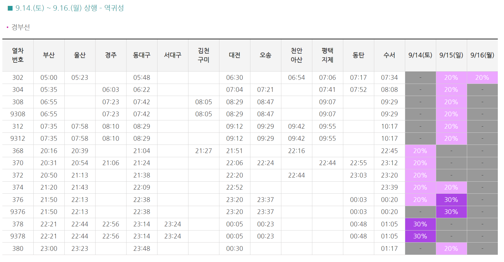 상행은 2024년 9월 14일(토) ~ 9월 16일(월) 기간 동안 운행하는 일부 SRT 열차