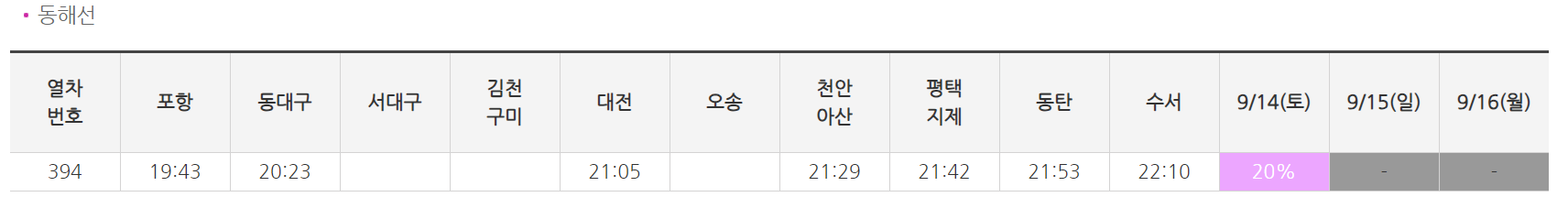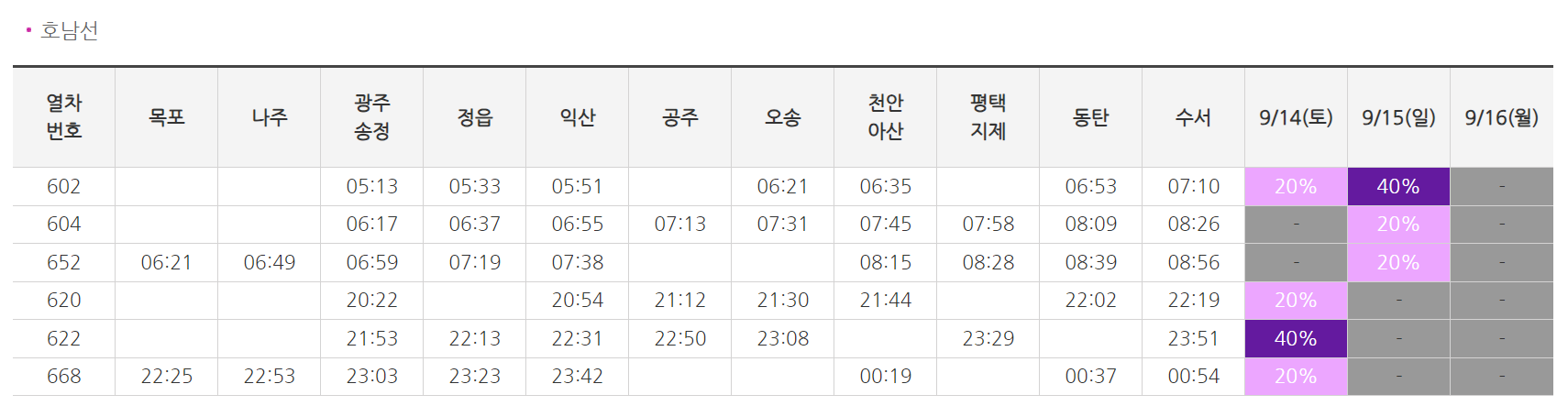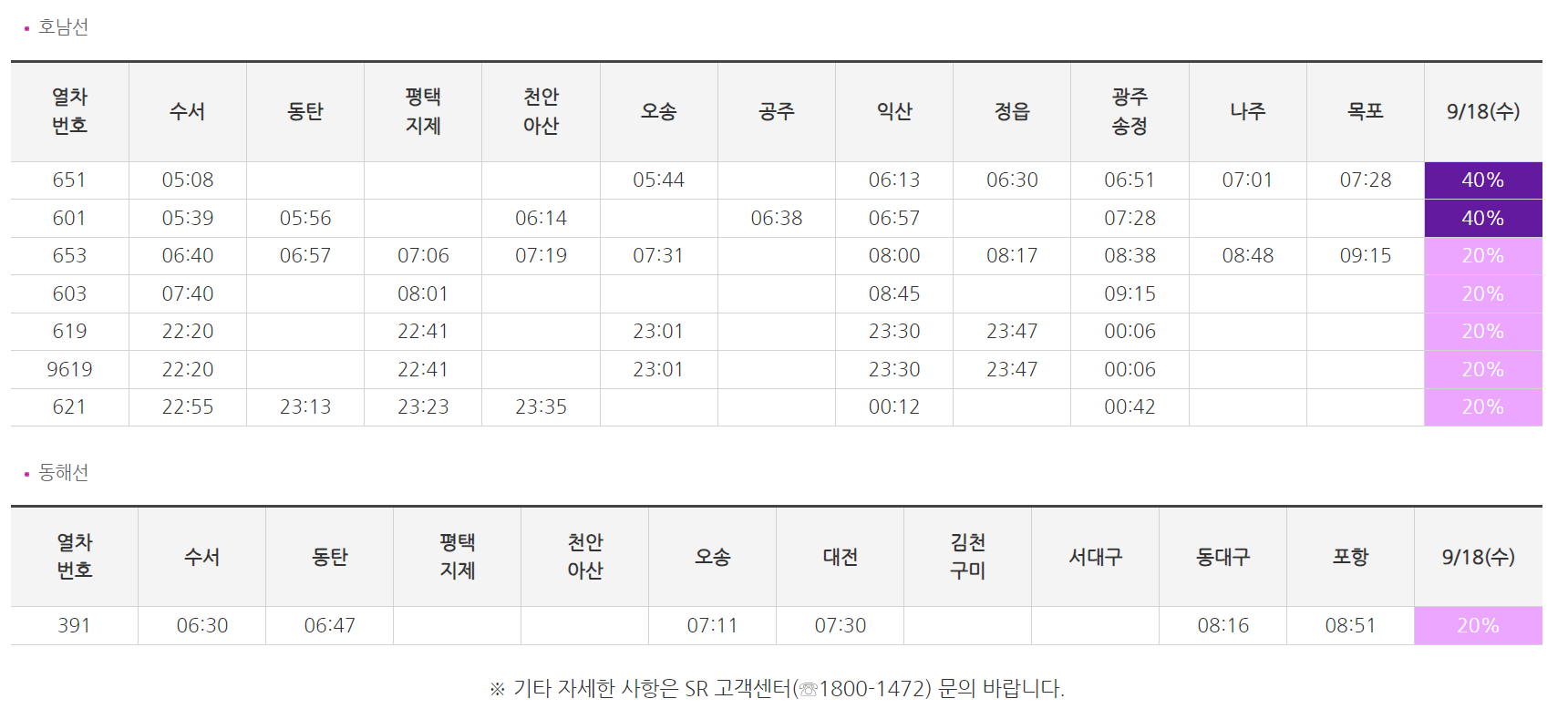 하행은 2024년 9월 18일(수) 운행하는 일부 SRT 열차