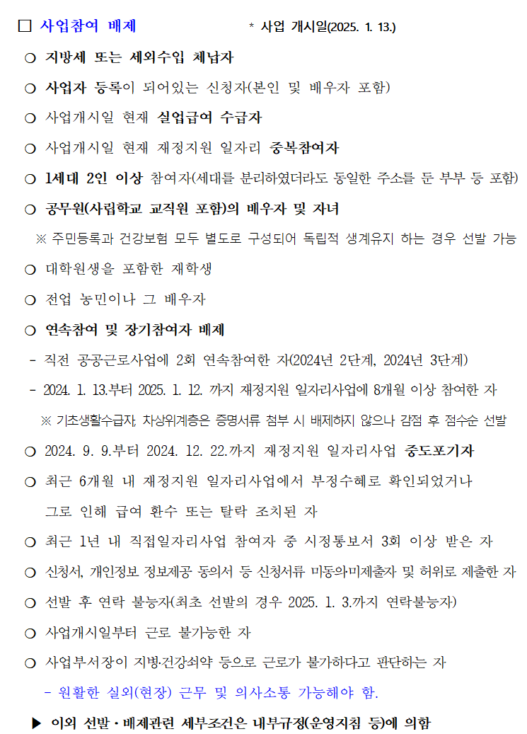 공공근로 일자리는 신청대상만큼 중요한 사업참여 배제 대상입니다. 이하 사업 개시일은 2025. 1.13일을 기준으로 합니다. 지방세 또는 세외수입 체납자, 사업자 등록이 되어있는 신청자의 본인 및 배우자, 사업개시일 현재 실업급여를 수급하고 있는 사람, 사업개시일 현재 다른 재정지원 일자리에 중복으로 참여하고 있는 사람, 1세대에서 2인이상 참여자(동일한 주소를 둔 부부 등), 공무원(사립학교 교직원 포함) 재직중인 배우자 와 자녀(주민등록과 건강보험 모두다 별도로 구성되어 독립적으로 생계유지를 하는 경우에는 선발이 가능함), 대학원생을 포함한 재학생, 전업 농민 또는 그 배우자, 연속적으로 참여 또는 장기적으로 참여했던 사람, 진전 공공근로 사업에 2회 연속적으로 참여 했던 사람, 2024년 1월 13일 부터 2025년 1월 12일까지 재정지원 일자리사업에 8개월 이상동안 참여했던 사람(여기서 기초생활수급자이거나 차상위계층의 경우 증명서류 첨부 시에 배제되지 않지만 감점 수에 점수순으로 선발됨), 2024년 9월 9일 부터 2924년 12월 22일까지 재정지원 일자리 중도포기자 등이 있습니다.