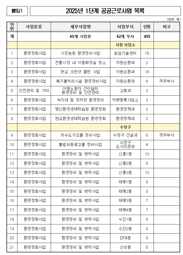 2025년 1단계 성남시 공공근로 일자리 사업은 총 65개 사업장에 62개 부서로 455명의 인원을 공공근로사업에 배치합니다.