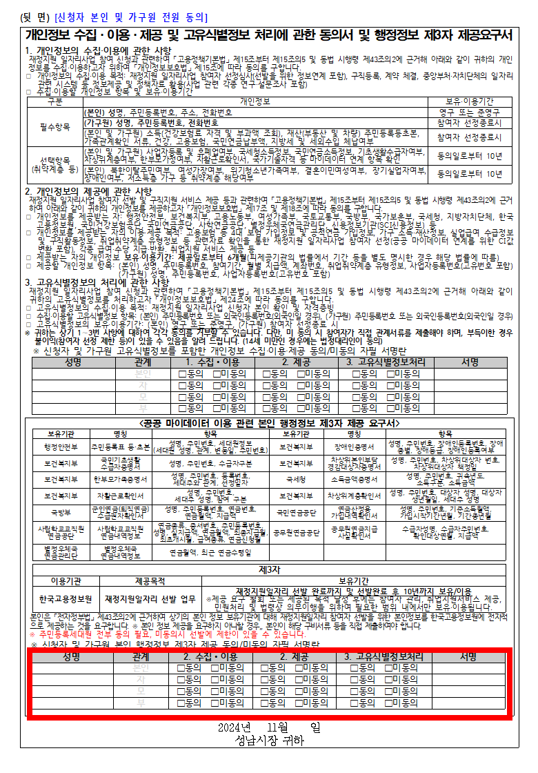 신분증은 필수로 준비해가야 합니다. 또한 개인정보 제공 동의서 작성시 본인 포함 다른 가구원들의 개인정보 제공 동의에 서명이 필수로 되어야 하니 함께 방문하지 못하시는 경우에는 미리 출력하셔서 아래 가족 동의 부분에 자필 서명을 해서 준비 해 가시면 됩니다.