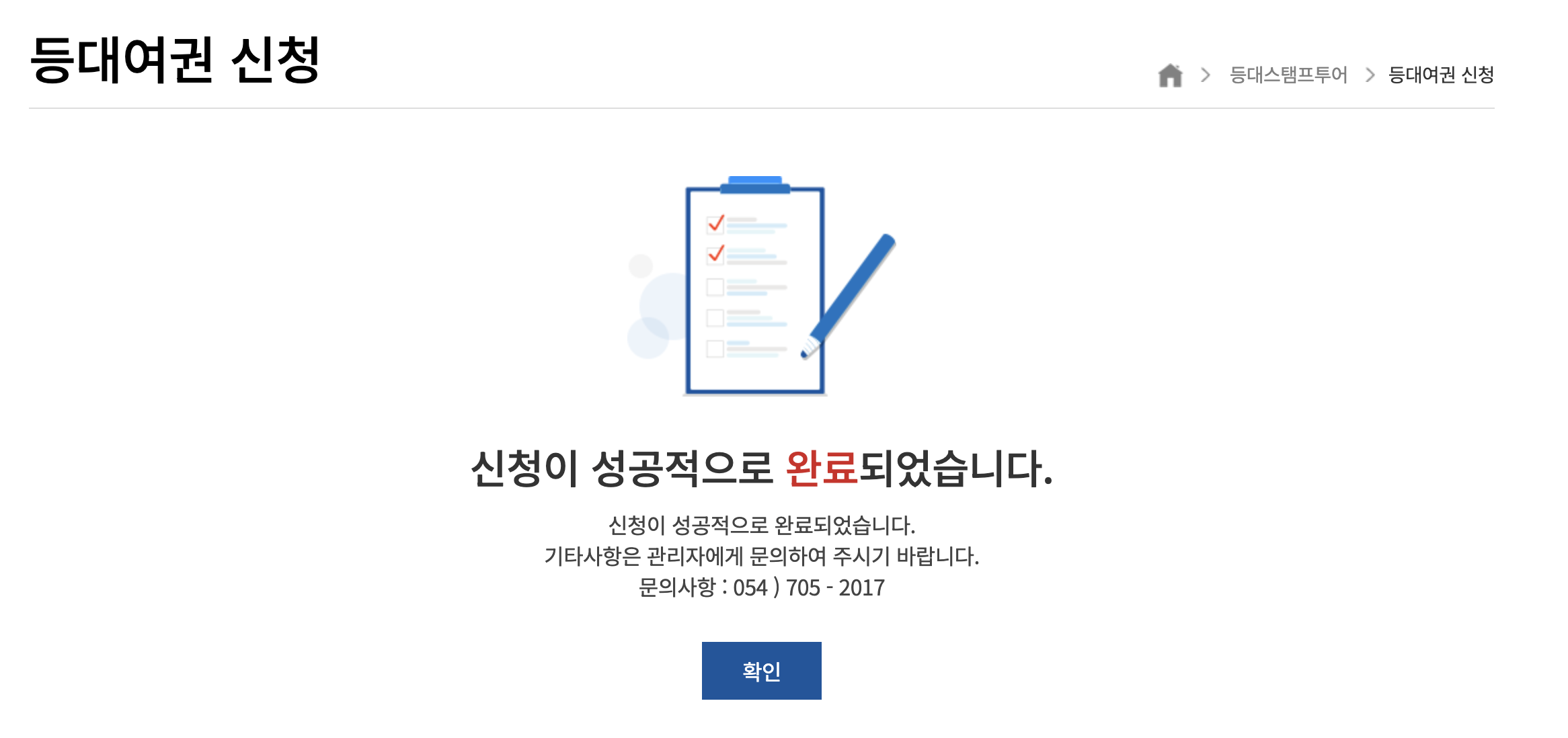 여섯째, 신청이 완료되었습니다 창이 뜨는 걸 확인합니다.