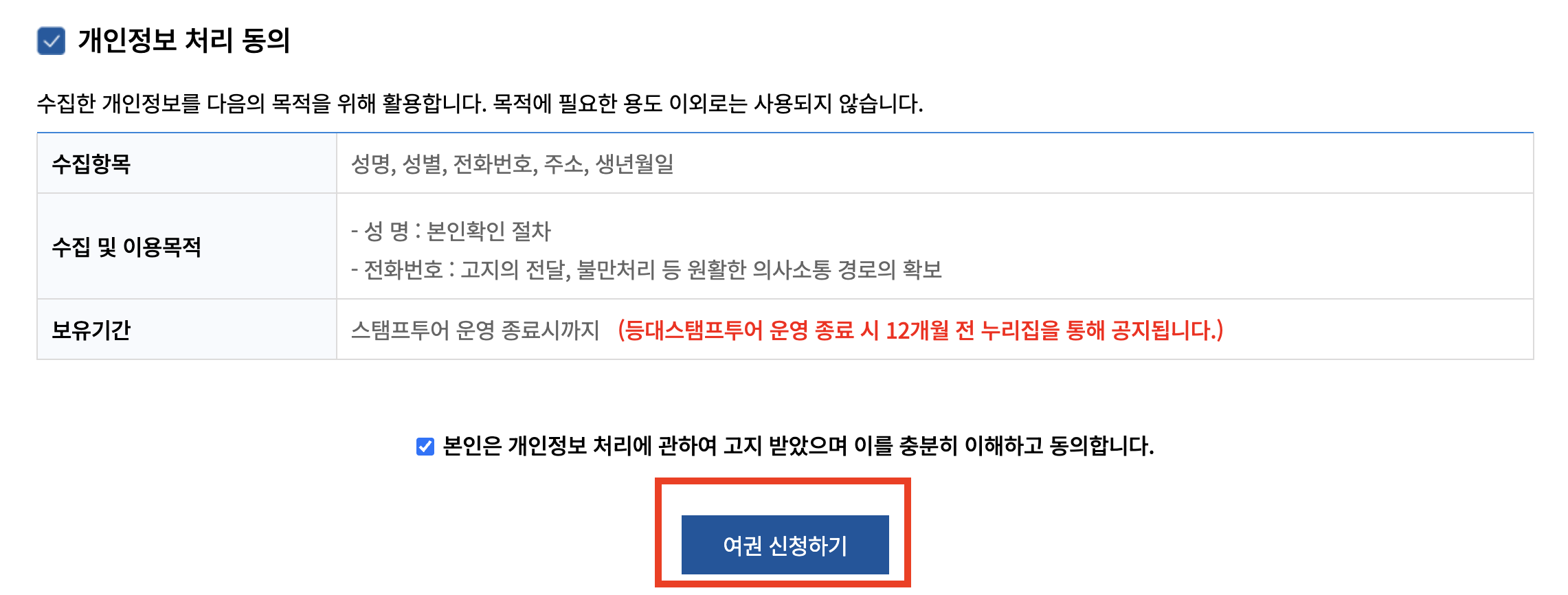 다섯째, 개인정보 처리 동의 후 여권 신청하기를 눌러 여권 신청을 완료해줍니다.